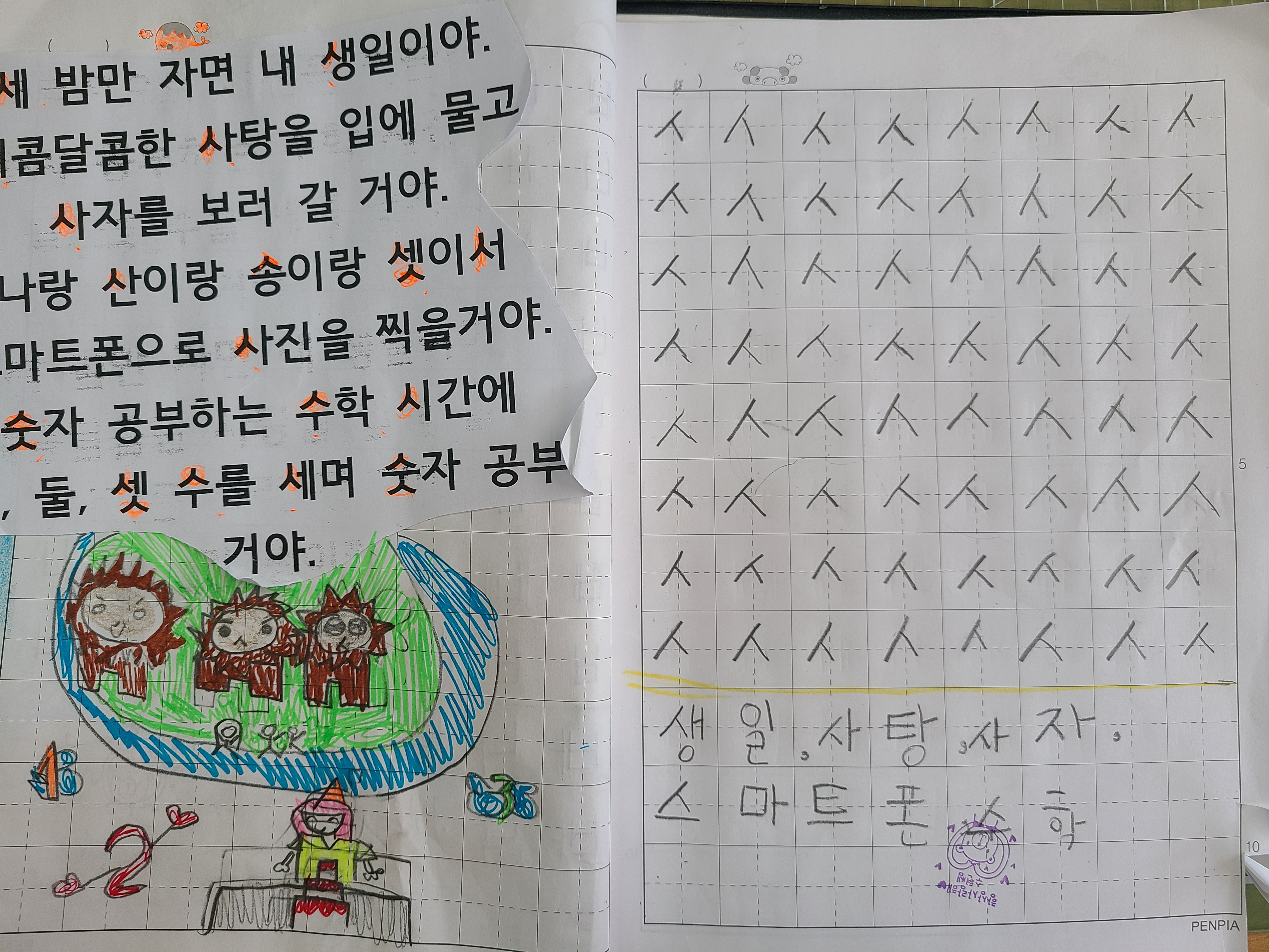 6.노트에 붙인후 한 어절씩 따라 읽기를 합니다.