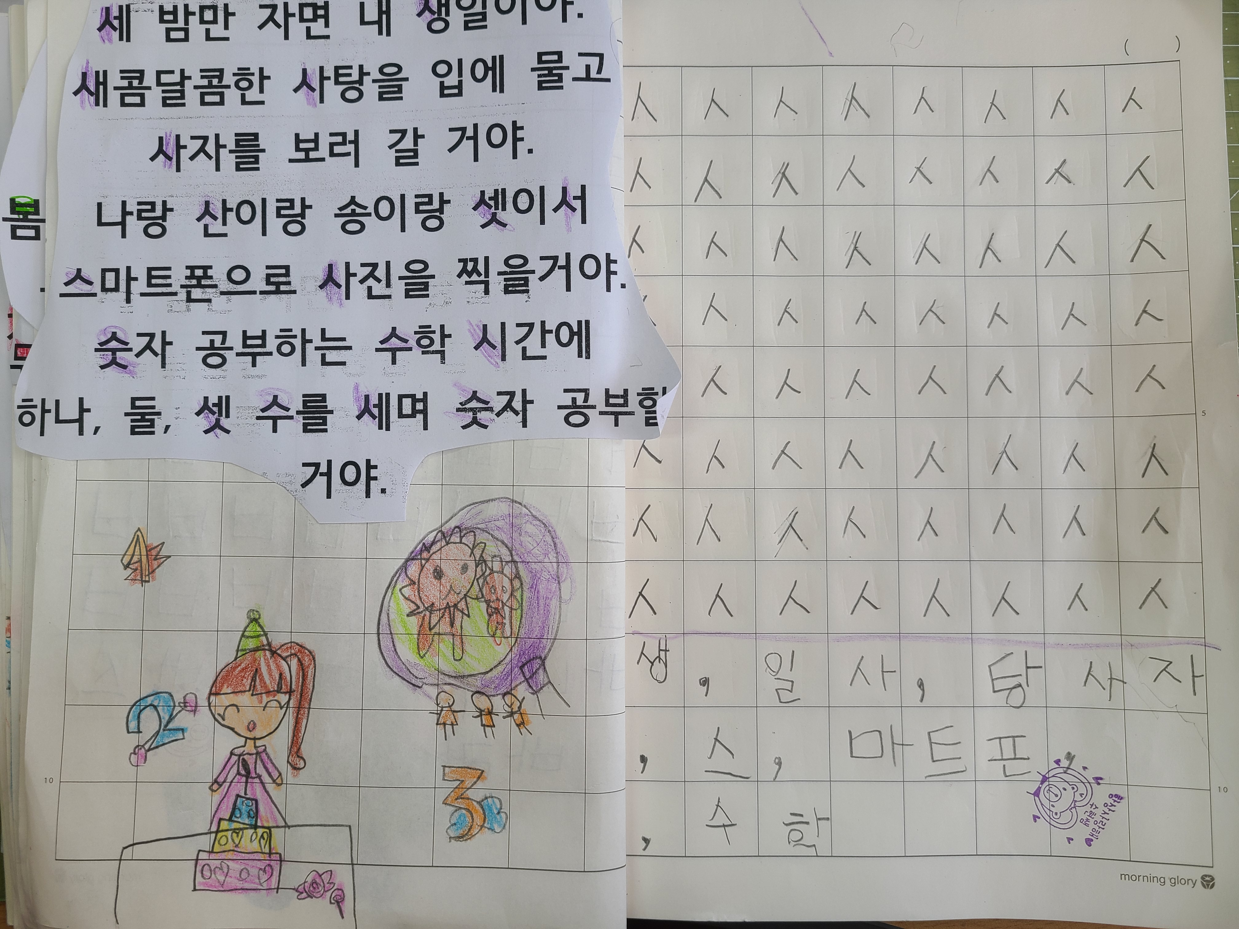 9. 선생님에게 확인받은 후 시간이 남은 친구들은 그림책내용을 그려봅니다.(그림은 크게 신경쓰지 않습니다.)
