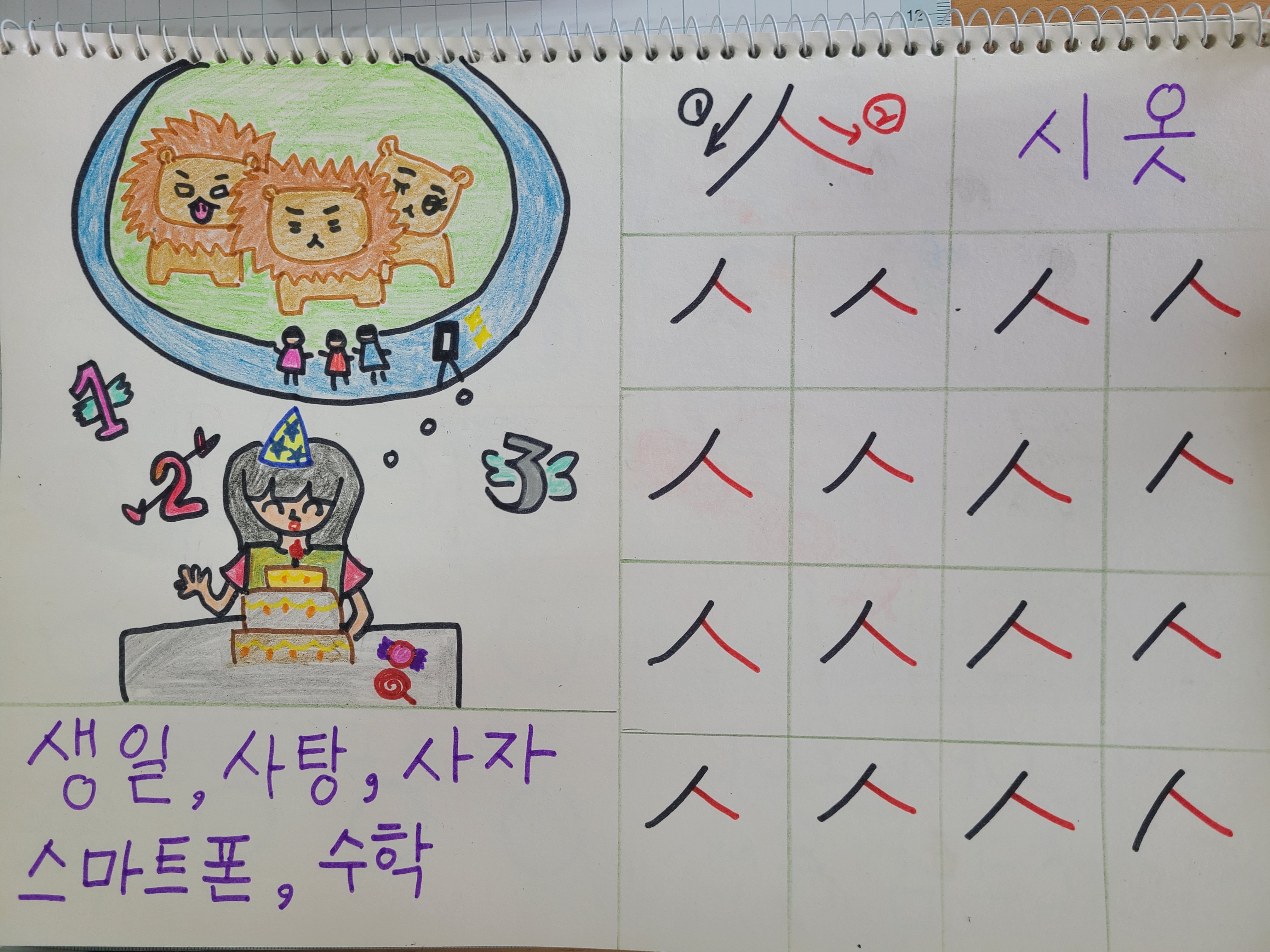 8. 바르게 ㅅ을 쓰고 아래에서 3줄 정도에 ㅅ이 들어간 단어를 씁니다.